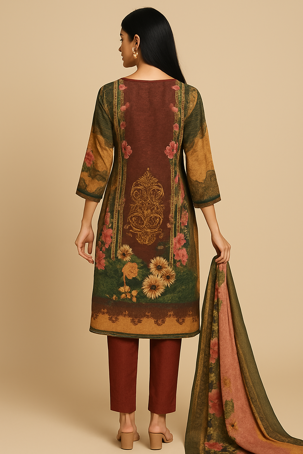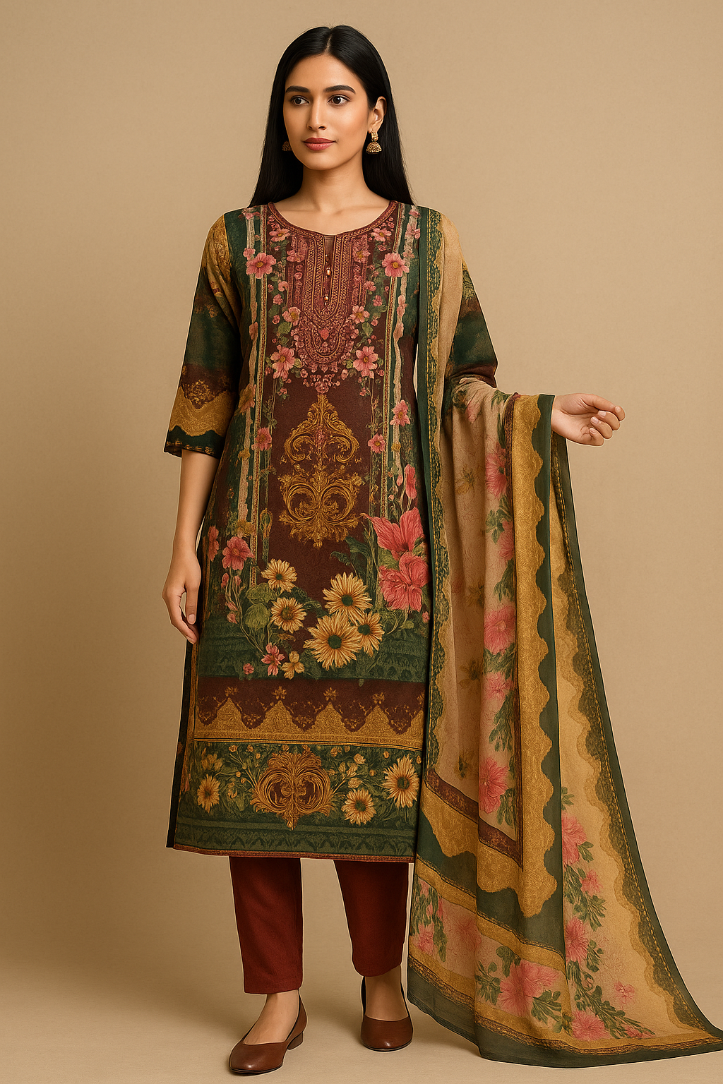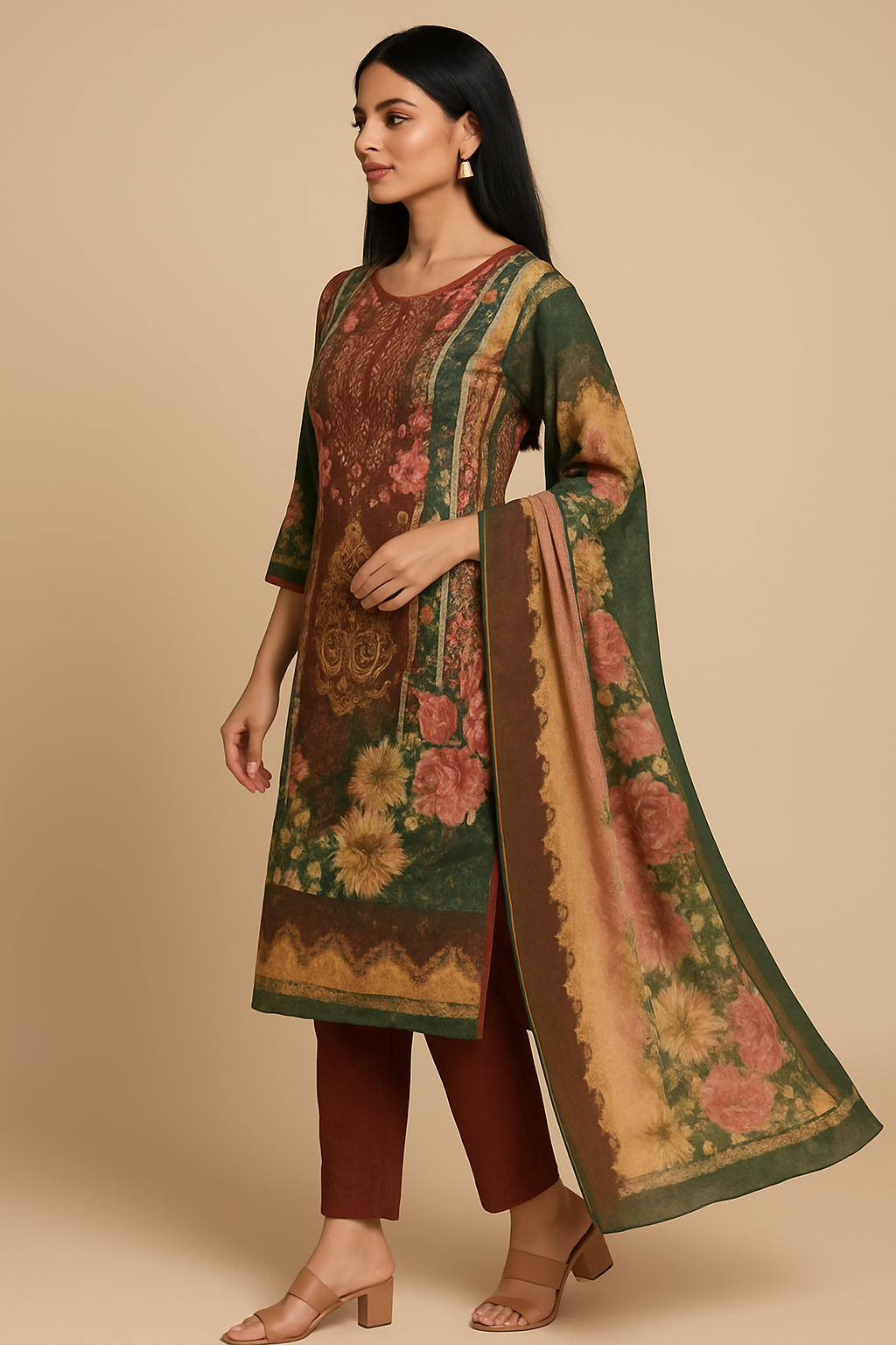 Bring a touch of timeless charm to your ethnic collection with this floral printed multi-color kurti set with matching pants and dupatta. The kurti features rich floral and ornamental motifs in earthy brown, green, and mustard tones, enhanced with delicate pink blossoms. Designed in a straight fit with side slits, it offers both comfort and elegance.